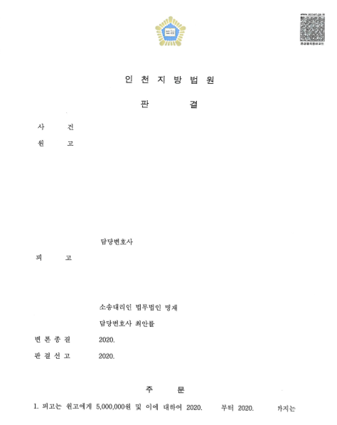 배우자 있는 이성(A)과 부정행위를 원인으로 손해배상 소송이 진행된 피고 사건입니다. 원고의 주장 및 증거에 피고와 A의 성관계에 대한 주장·입증이 없다는 점에서 피고 소송을 진행했습니다. 그 결과 피고는 원고에게 500만 원의 손해배상금을 지급하라는 판결이 선고되었습니다. 또한, 소송비용 측면에도 원고가 6분의 5를 부담하라는 판결이 선고되었습니다.