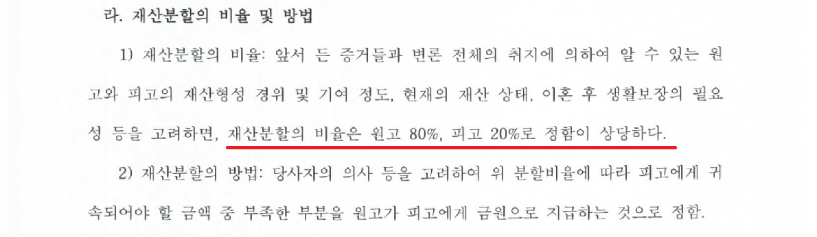 재산분할은 부부공동생활동안 이룩한 재산의 청산 뿐만 아니라 이혼 후의 부양의 의미도 가지므로, 혼인기간이 길면 길수록 실질적으로 가정 경제에 아무런 기여를 하지 않은 배우자라도 기여도 비율이 올라갈 가능성이 많습니다. 특히 이 사안의 경우 혼인기간이 10년이 넘었고, 남편이 실질적으로 돈을 벌어오지는 않았으나 경제활동을 하기는 했으며, 아이가 어릴 때 가정주부로 잠시간 양육을 맡은 적도 있었기에, 자칫 잘못하면 30% 이상의 기여도가 인정될 수도 있었습니다.