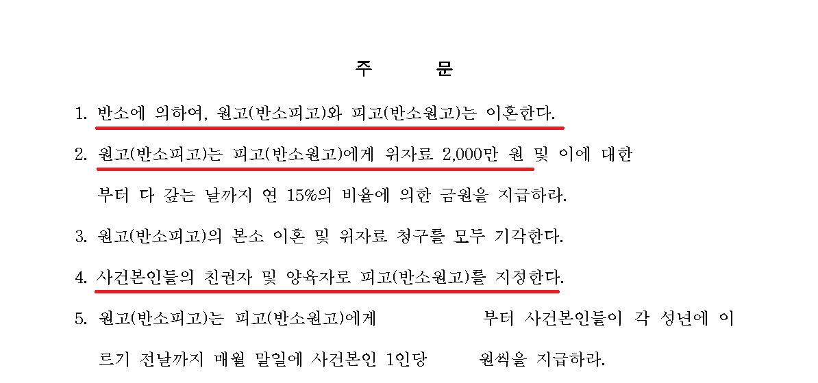 외국인 아내(원고)의 이혼, 위자료 등 모든 청구는 기각되고, 의뢰인(피고)의 이혼청구, 위자료 청구, 친권 양육권자 지정, 양육비 청구가 모두 받아들여졌습니다.