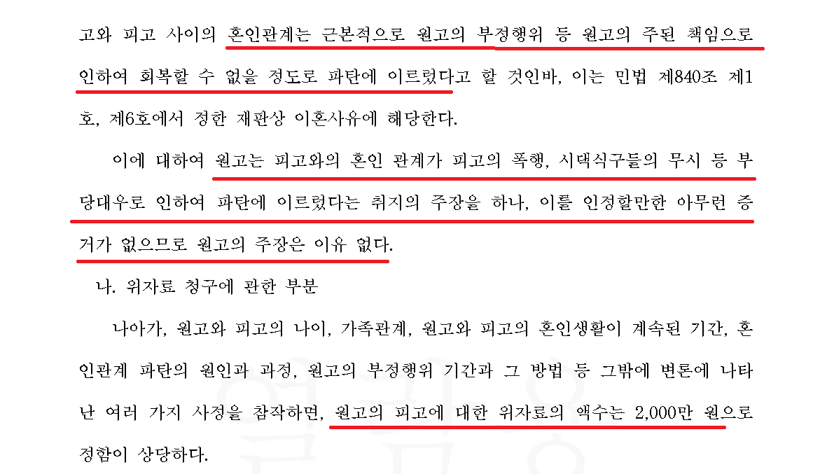 국제결혼의 경우 나이 어린 외국인 여성이 부당한 대우를 당하거나 가정폭력이 벌어지는 사건도 빈번하므로, 잘못 대응하면 재판부의 선입견으로 명확한 폭행 등의 증거 없이도 한국인 남편의 귀책으로 인해 이혼판결이 내려질 수도 있습니다. 이 사건에서도 외국인 아내는 자신의 지인들을 동원해 “한국인 남편이 아내를 때렸다. 시어머니도 매번 욕을 하며 괴롭혔다.”는 내용의 허위 진술서를 제출했습니다.