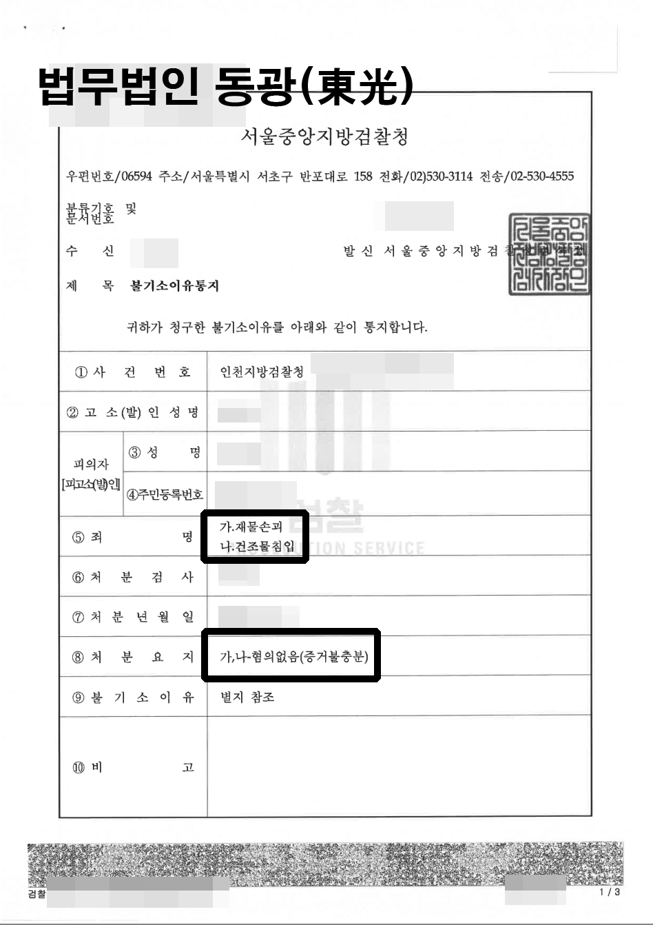 의뢰인들은 시무실 출입문에 설치되어 있던 출입문 자물쇠를 손괴하고 안으로 들어간 사실은 인정 되었습니다. 하지만 의뢰인들은 당시 사무실 주인으로부터 법원의 결정이 나왔으니 사무실로 오라는 연락을 받고 현장에 도착 하였습니다. 하지만, 고소인이 문을 열어주지 않자 이후 열쇠공에 의해 개방된 사무실 문을 통해 안으로 들어가게 된 것 뿐이라고 주장하는 상황 이였습니다. 법무법인 동광은 당시 고소인과 피의자들 사이에서 청구 소송이 진행중인점. 사무실 주인으로부터 사전에 허락을 받은 점 등 피의자들이 재물손괴의 고의성이 없다는 부분을 적극 변론하여 의뢰인들 모두 혐의없음 처분을 받게 되었습니다.