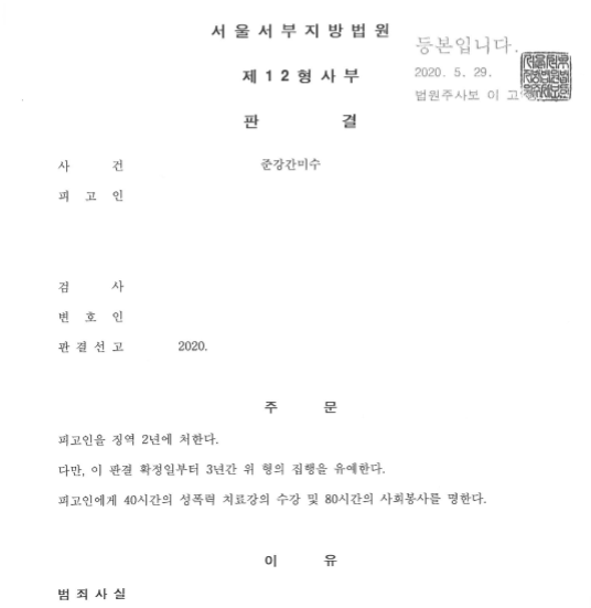 지인들과 방을 잡고 술을 마시다 잠이 들었던 피해자가 피의자에게 추행을 당한 사건입니다. 피해자는 자신이 일어났을 때, 하의가 벗겨져 있었으며 팬티가 뒤집힌 상태로 입혀져 있었다고 말했습니다. 증거는 사건 후 피해자와 피의자의 통화녹음, 함께 했던 지인들의 증언뿐이었습니다. 지인들이 목격한 상황은 고소 사실이 벌어지기 전 음주 단계이었습니다. 피의자가 피해자에게 사과하는 녹음과 당시 상황에 대한 피해자의 설명을 인정하는 피의자의 태도에 고소 사실을 준강제추행이 아닌 준강간미수로 정한 후 진행했습니다. 당시 피의자는 피해자가 생리 중이었기 때문에 관계를 나아가지 않았다는 점을 강조했습니다. 피의자는 강제추행이 아닌 강간미수의 혐의를 인정받아 징역 2년에 집행유예 3년, 성폭력 치료강의 및 사회봉사를 이행하라는 판결을 받았습니다.