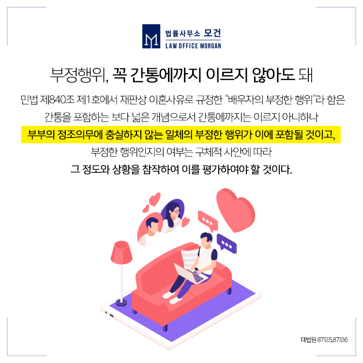 법률사무소 모건은 강남/강북 등 지역상관없이 의뢰인의 이혼소송 및 상간녀·상간남소송을 도와드리고 있습니다. 이다슬 대표 변호사는 다수의 상간자소송을 맡아 의뢰인에게 유리한 판결을 이끌어낸 바 있으며 증거가 부족한 상황 속에서도 특유의 변론능력을 발휘하여 위자료를 이끌어낸 성공사례를 보유하고 있습니다.