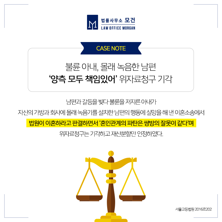 이에 아내는 '자신의 동의없이 수집한 사적인 문자메세지와 강요하여 받아낸 자술서는 위법한 증거'라고 주장하였는데요. 재판부는 이는 법원의 재량인데다 내밀하게 이루어지는 부정행위의 입증 곤란을 고려하면 개인적 법익 보호보다는 공익적 요청이 우선되어야 한다고 보고 '아내 B씨와 상간남 C씨는 각자 A씨에게 위자료로 2,000만원을 지급하라'고 원고승소 판결하였습니다(대전가정법원 2014드단2XX).