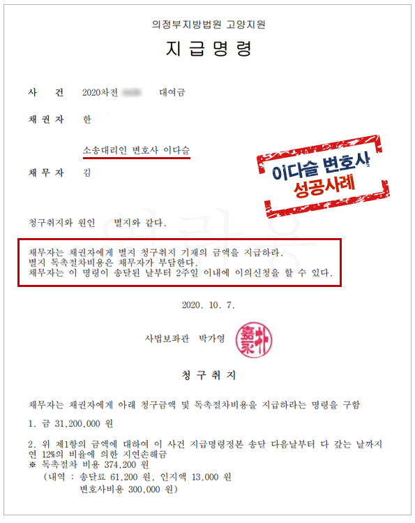 당초 변제기한은 2017년 2월이었으나 3년이 지나도록 원금조차 변제되지 않은 바, 의뢰인이 매우 관대하게 대여금을 상환받고 있었던 점을 고려하여 법원에 지급명령을 신청하였고 법원은 이를 받아들여 채무자에게 원금과 지연손해금의 지급을 명령하였습니다.