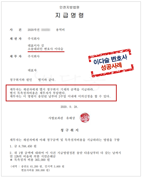 이에 이다슬 대표 변호사는 의뢰인을 대리하여 용역비 미수금에 대한 지급명령을 신청하였습니다. 이에 대한 소명을 위해 의뢰인이 제공한 운송용역제공 및 거래명세서와 일자에 맞추어 발행한 세금계산서 발행내역, 입출금내역을 제출하였고 법원은 이를 받아들여 채무자에게 미수금과 지연손해금의 지급을 명령하였습니다.