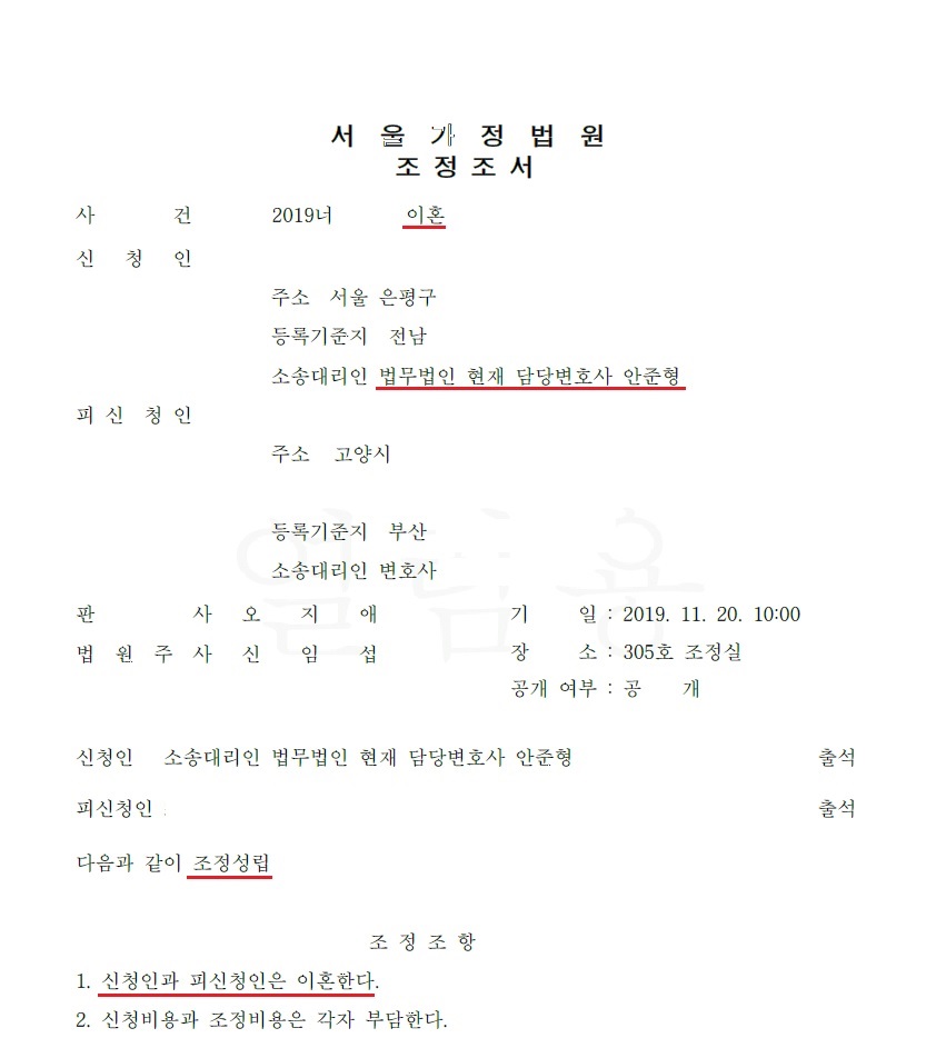 - 이러한 당근과 채찍을 적절하게 활용한 결과, 이혼 조정신청이 들어간 지 얼마 되지 않아 곧바로 이혼 조정 결정을 받을 수 있었으며, 조정비용도 각자 부담하는 것으로 마무리되었습니다.