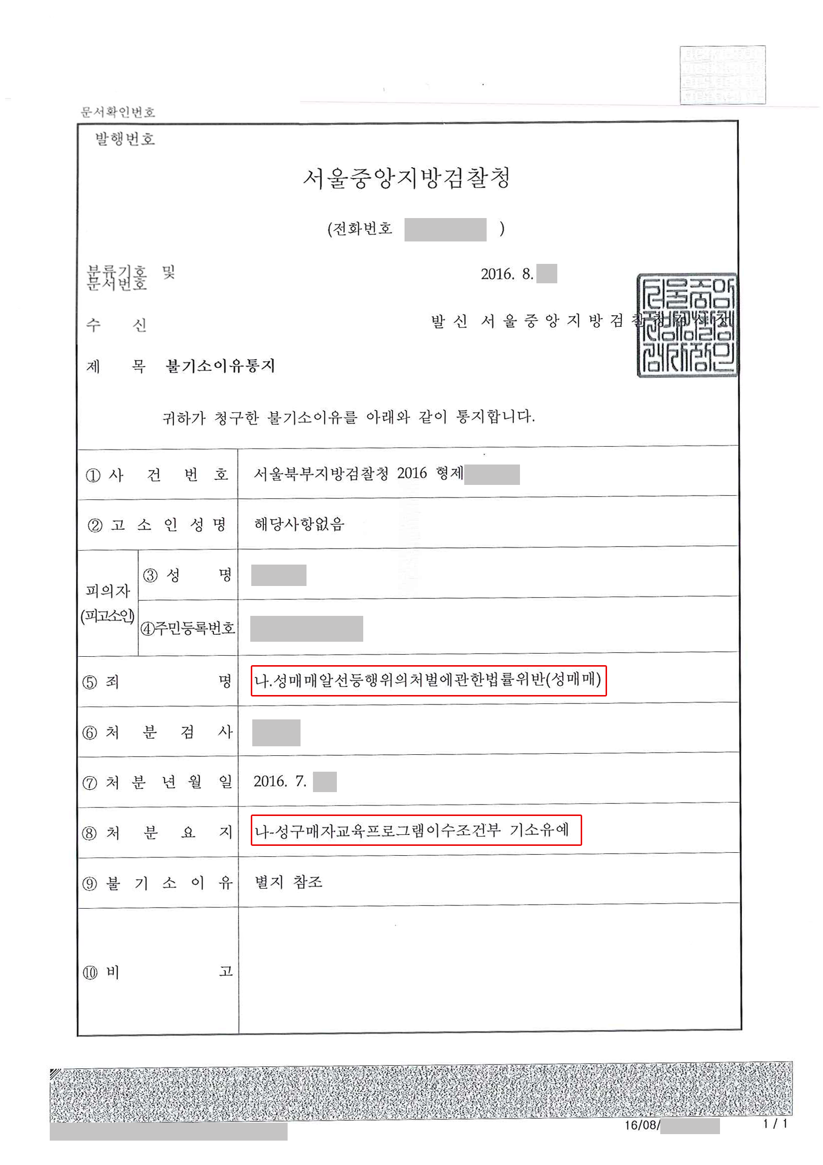 경찰조사단계에서부터 의뢰인을 조력하였습니다. 경찰과 검찰의 강압적인 수사나 수사 조작을 방지하기 위하여 항상 의뢰인과 동행하였습니다. 또한 경찰조사시, 의뢰인의 증언을 정리하였고, 불필요한 진술이나 증언은 하지 않도록 이끌었습니다. 수사 과정에서는 검사로부터 불구속 수사를 유도하여 의뢰인은 구속수사를 면할 수 있었습니다. 검찰수사단계시엔 검사와의 면담을 통하여 의뢰인의 정상참작의 여지를 끊임없이 주장하였습니다. 이 외에도 각종 양형자료 등을 준비하여 제출함으로써 의뢰인 보호에 힘썼습니다. 검찰은 성구매자교육프로그램이수조건부 기소유예를 선고하였습니다. 의뢰인의 범죄가 인정되기는 하나 우발적인 초범이었던 점, 제출한 각종 양형자료를 살펴본 결과 재범의 여지가 없는 점 등을 고려하여 선고한 것으로 보입니다.