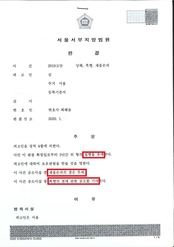 재물손괴는 무죄를, 폭행은 공소기각을 받아 상해죄만 남긴다면 최상의 결과가 되리라 판단하였습니다.