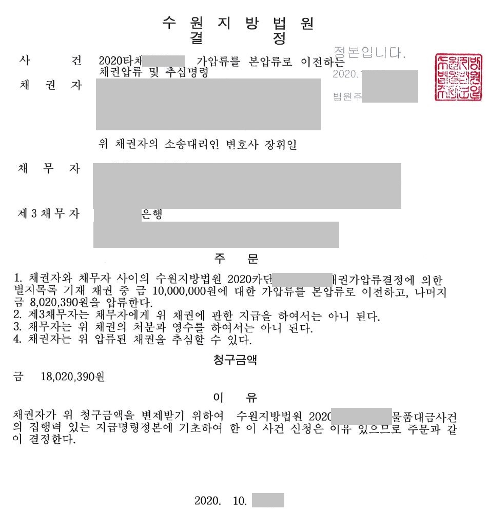 장휘일 변호사는 채무자의 법인 계좌 번호를 특정하여 최소한의 가압류 신청을 진행하였고, 결국 그 계좌는 위 채무자의 주거래은행의 계좌였습니다. 법원 역시 최소화된 법인 계좌 가압류 신청에 채권자 편을 들어주었고 위 법인계좌 가압류에 성공하게 되었습니다.
