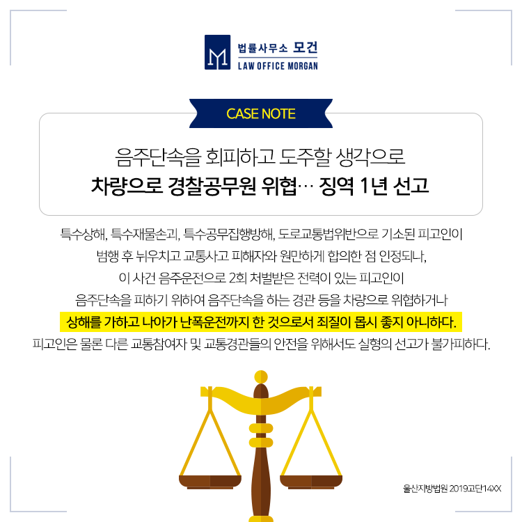 최근에는 강해진 음주운전처벌기준에 따라 음주단속을 피할 요량으로 운전하다 특수상해, 특수재물손괴, 특수공무집행방해 혐의 등이 추가되어 엄중한 처벌이 적용될 수 있으므로 종로/마포/광화문 형사전문변호사의 적극적인 자문을 구하시기를 바랍니다.