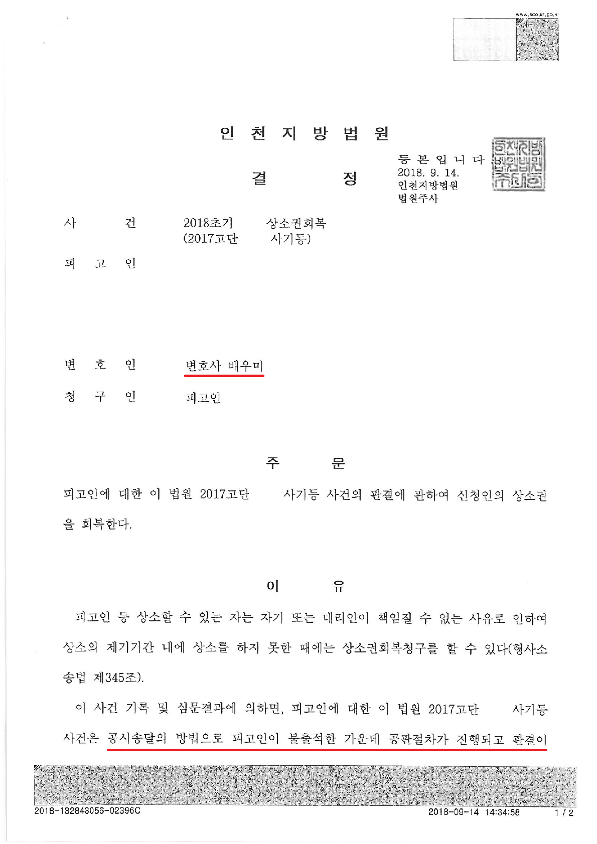 배우미 변호사의 변론대로 의뢰인이 책임지지 못할 사유로 공시송달을 통해 재판이 진행되었으므로, 상소권을 회복한다는 결정을 이끌어 낼 수 있었습니다.