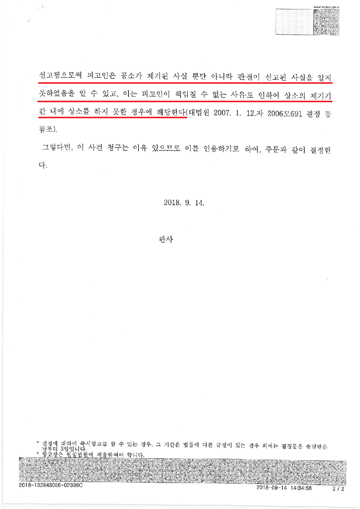 이 경우 의뢰인은 체포되어 구치소에 수감된 날 판결 선고 사실을 알게 된 것이므로, 그 날로부터 7일이라는 짧은 기간 안에 상소권 회복신청을 해야만 했습니다.