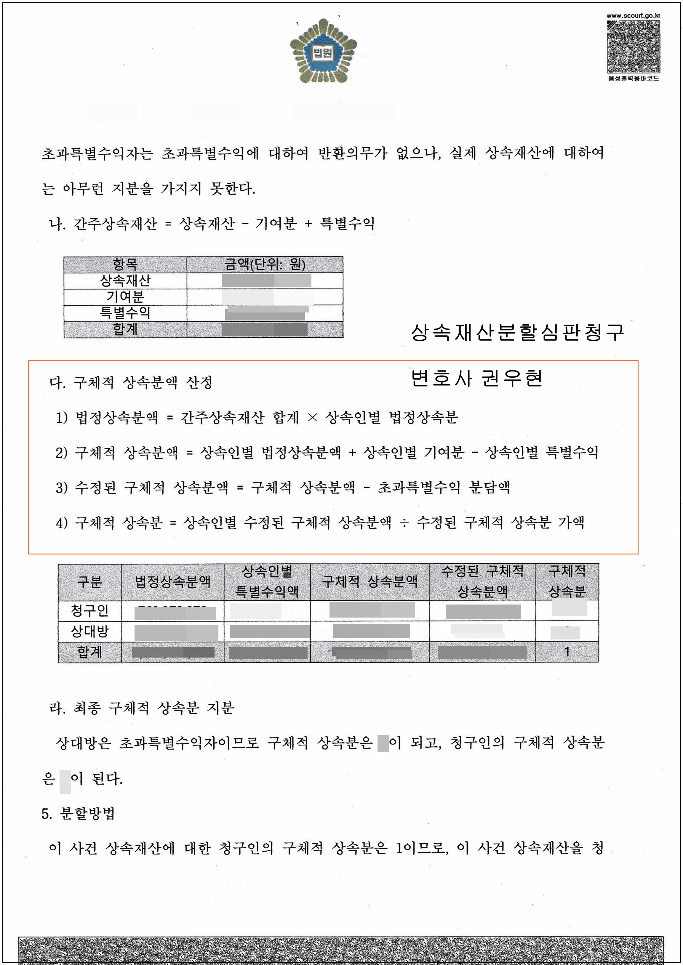 2) 구체적 상속분액 = 상속인별 법정상속분액 + 상속인별 기여분 – 상속인별 특별수익