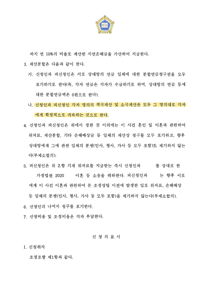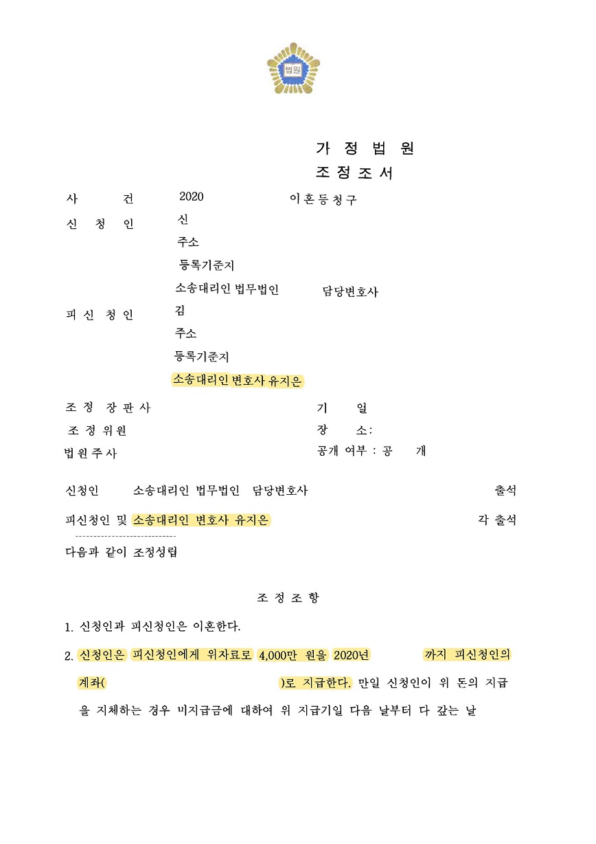 통상적으로 위자료 액수가 3천만 원을 초과하여 인정되는 경우가 많지 않음에도 결국, 남편이 아내에게 위자료로 4천만 원을 지급하는 내용으로 원만하게 조정이 성립되었으며, 각자 명의의 재산은 각자에게 귀속하는 것으로 재산분할을 방어하며 성공적으로 마무리된 사례입니다.