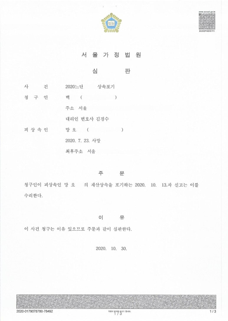 이 사건의 경우 사건본인인 망인은 2020. 7. 말경 돌아가셨고, 상속인들은 2020. 10. 초에 사무실에 방문해서 사건을 맡겨주셨어요. 3개월이라는 기간에 맞춰 빠르게 서면을 작성해 2020. 10. 13. 신청서를 접수했고, 2020. 10. 30. 인용결정을 받을 수 있었죠. 즉 한달이 채 안 걸렸어요.
