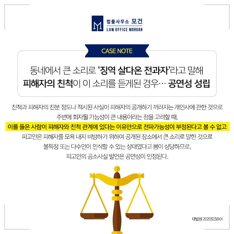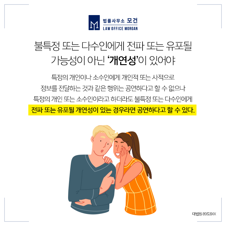 또한 A씨가 비록 직장동료인 B씨에게만 사실을 유포하였더라도 B씨를 통해 이같은 발언이 불특정 또는 다수인에게 전파될 가능성이 있다고 봄이 상당하므로 공연성을 인정한다고 보고 A씨에게 벌금 150만원을 선고한 사례입니다(인천지법 2016고정10XX).