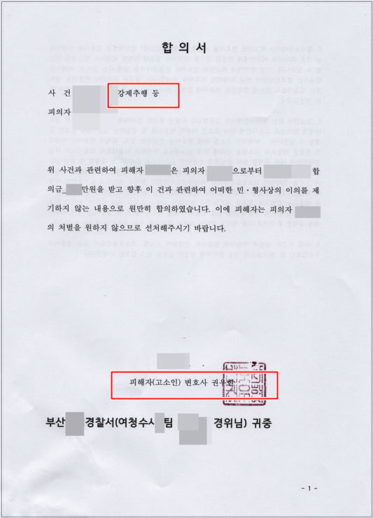 3. 아래 사건은 성범죄 피해자의 변호사로 선임되어 고소장을 제출하고 수사입회한 뒤, 부족한 점을 고소보충진술서로 보완한 뒤, 피고소인과 직접 연락하여 상당한 금원을 받고 합의한 사례입니다.