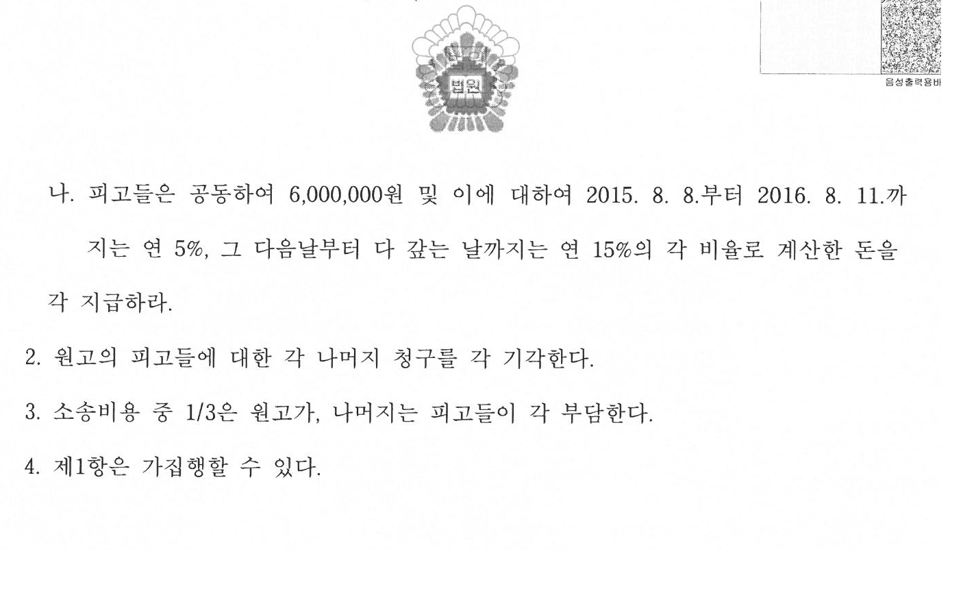 판결 내용은 가맹본사가 원고에게 2,460만원을 주고, 가맹본사와 직원(원고와 가맹계약을 실제 체결한 직원)이 공동으로 600만원을 지급하라는 내용입니다. 저는 가맹본부만을 상대로 하지 않고 직접 허위의 예상매출액을 고지하여 가맹계약을 체결한 직원까지 함께 소송을 하였습니다.