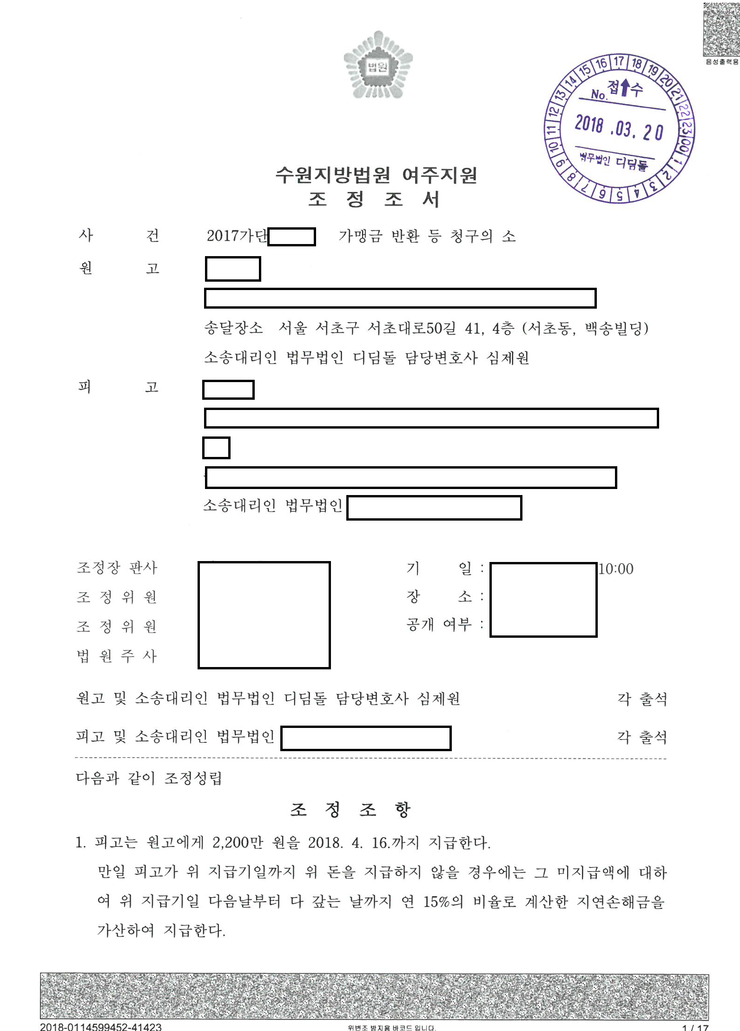 프랜차이즈 소송에서 조정이 성립되어 승소를 하였습니다. 우리가 원고쪽이었습니다. 총 3,000만원을 청구했는데 2,200만원으로 조정이 되었습니다. 조정이 성립되면 확정판결과 동일한 효력입니다.