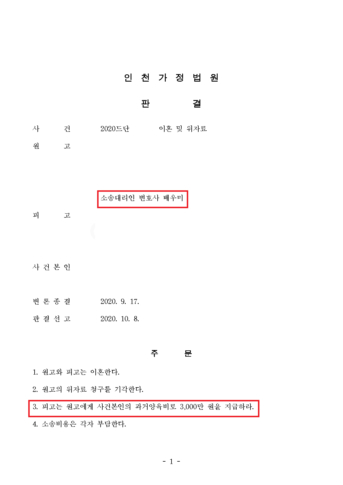 아이가 성년이 되자 의뢰인은 남편과의 인연을 정리하기 위해 이혼소송을 제기하면서, 15년간 지급받지 못한 과거 양육비를 청구하는 소송을 제기합니다.