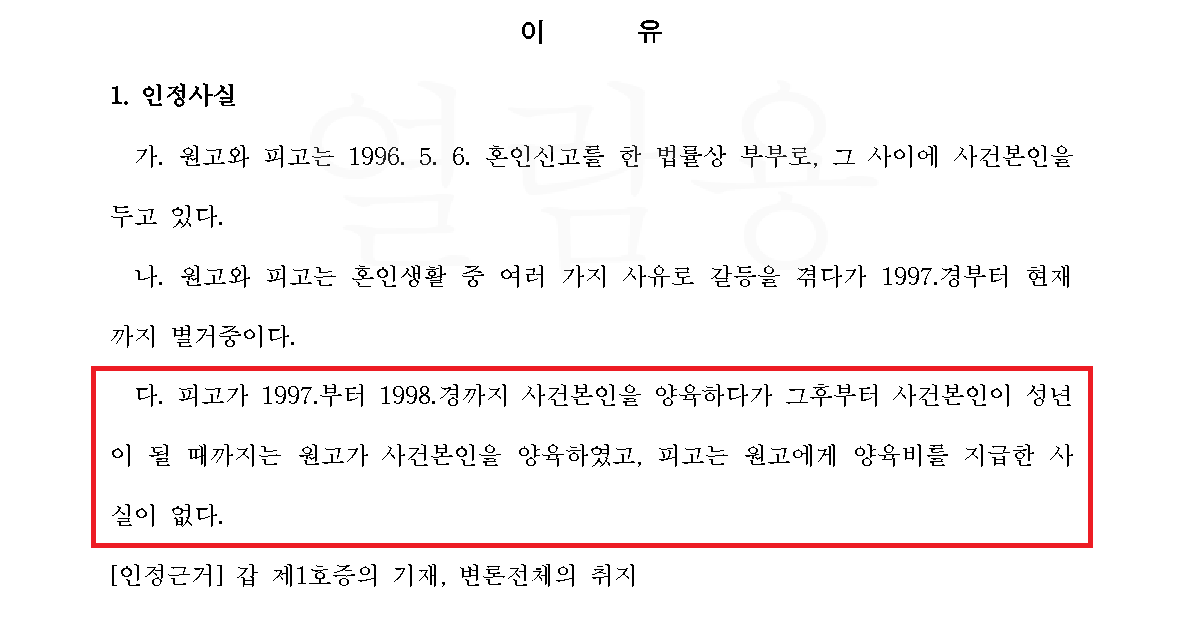 이 때 법원은 과거양육비 전액을 일시에 지급하도록 명하면 상대방에게 지나치게 가혹한 결과가 된다는 이유로 분담 범위를 줄이고 있는데(대법원 1994. 5. 13. 선고 92스21 전원합의체 판결), 의뢰인은 15년간 경제적 고통에 시달렸음에도 양육비가 감액될 위기에 처한 것입니다.
