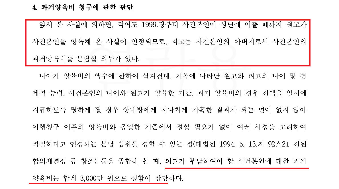 법원은 기초생활수급자 및 장애인인 피고에게 15년간 과거양육비 3,000만원을 부담하라는 판결을 내렸습니다.