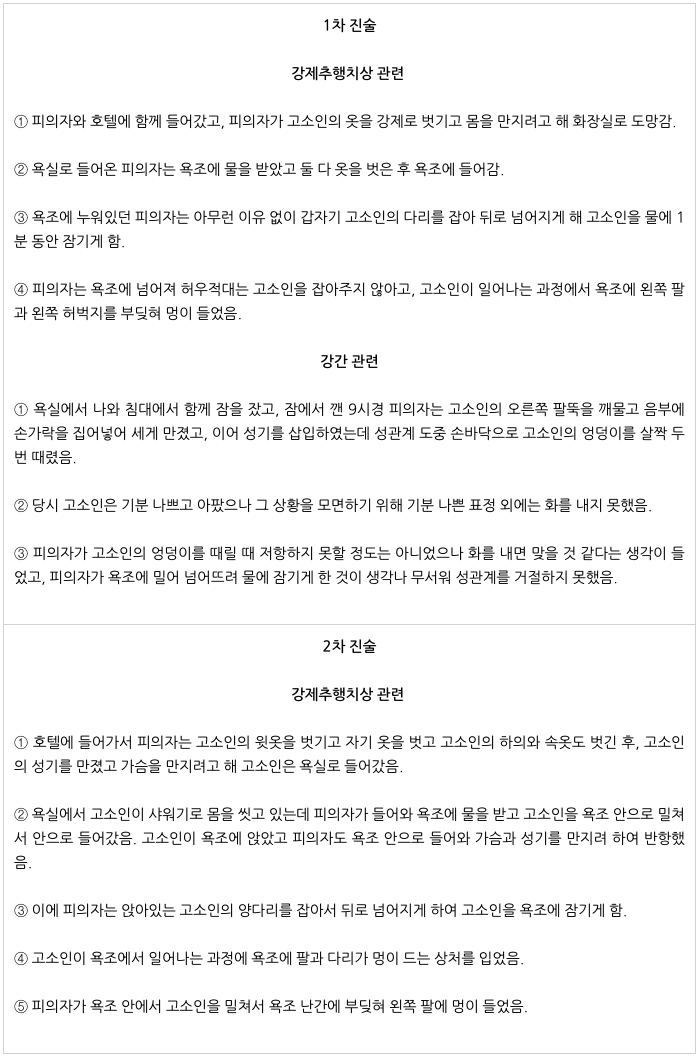 고소인은 2차례에 걸쳐 조사를 받았는데, 진술을 정리해 나열해 보면 다음과 같아요.