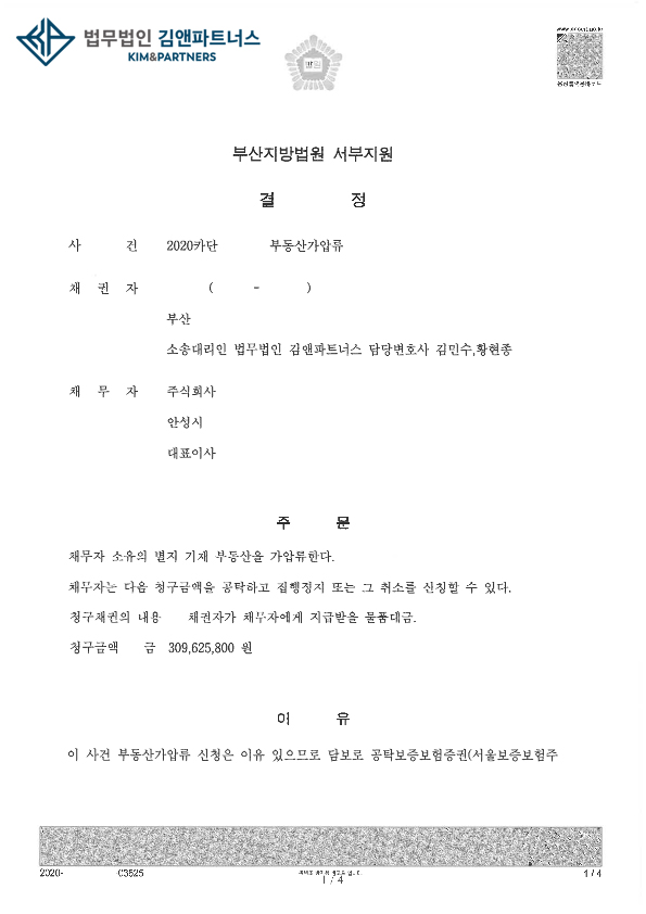 황변호사는 소송의 실익을 확보하기 위해 우선 상대방 소유의 공장 등 부동산에 대해 신속하게 가압류 신청을 하였고 결정을 받았습니다.