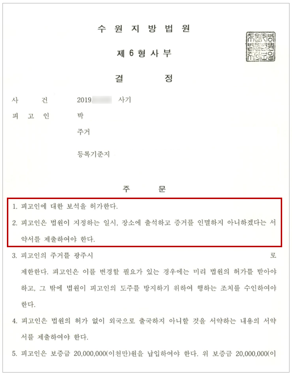 법원은 보증금 납입과 법원이 지정하는 일시·장소에 출석하고 정해진 주거지에서 거주하는 등의 조건 하에 의뢰인의 보석허가를 결정하였습니다. 이에 따라 의뢰인은 불구속상태에서 항소심 재판을 준비할 수 있었습니다.