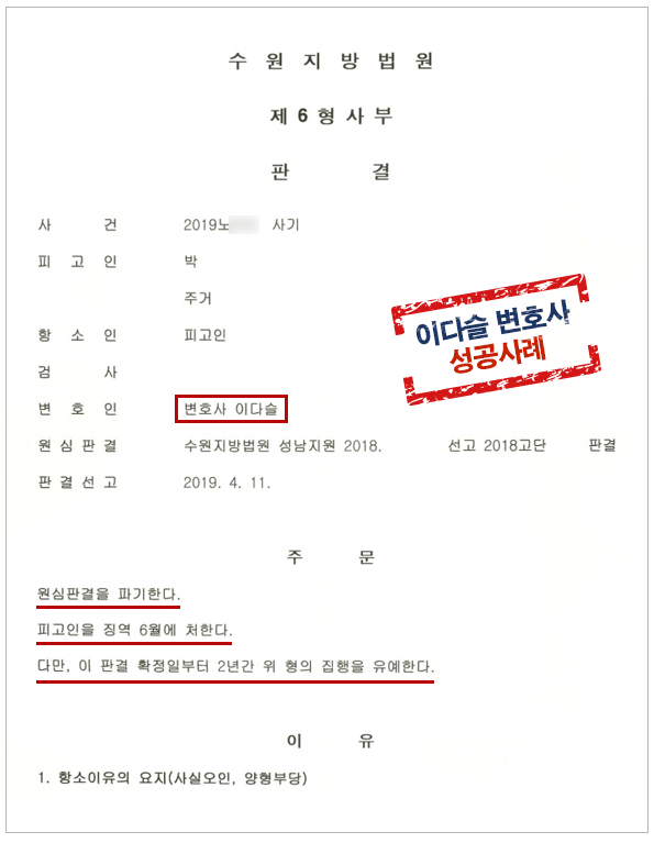 결국 이러한 양형부당 주장이 받아들여져 의뢰인은 1심에서 징역 6월이 선고되었으나 항소심에서 징역 6월에 집행유예 2년으로 감형받을 수 있게 된 사례입니다.
