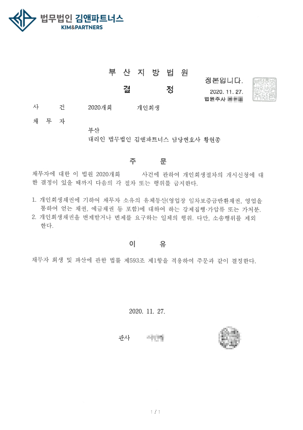 황변호사는 최근 부산에서 개인회생 사건을 담당하여 금지명령을 받았습니다.