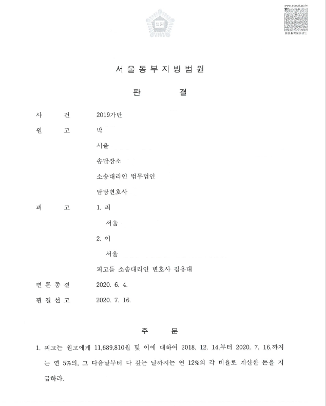 이에 본 법률사무소가 민사소송 절차에서 위와 같은 주장을 하였고, 결국 서울동부지방법원은 2020년 7월경 본 법률사무소의 위와 같은 주장을 모두 받아들여 "원고의 금융거래내역 자료에 나타난 돈의 성격이 근로의 대가로 매월 정기적, 계속적으로 지급된 것인지, 아니면 다른 성격의 금원인지 여부를 확인할 수 없는 점 등에 비추어 보면, 위 증거 및 갑호증의 각 기재만으로 원고가 이 사건 사고 당시 월 1,000만원의 고정적인 수입을 얻고 있었다고 인정하기에 부족하고 달리 이를 인정할 증거가 없다."라고 판시하였습니다.