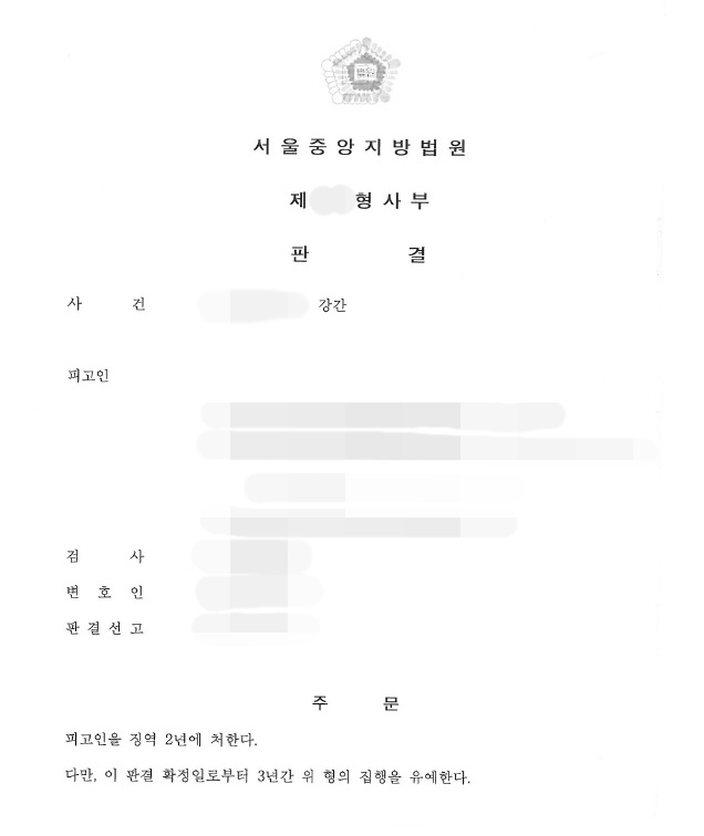 위와 같은 당 변호사의 노력은, 강제추행 전과가 있는 의뢰인, 강간 혐의가 cctv로 확인되어 강간죄의 처벌이 명확했던 이 어려운 사건에서 '집행유예'라는 최고의 결과를 이끌어 냈습니다.