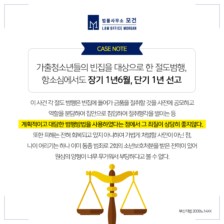 A군과 B군은 과거 강도상해죄로 소년부송치결정을 받았음에도 재차 범죄를 저지른 점이 불리하게 작용되었습니다. C군은 특수절도만 행한 점과 그 절취한 피해액의 총 합계가 그리 크지 않은 점 등이 고려되어 집행유예로 실형을 피할 수 있게 되었습니다.