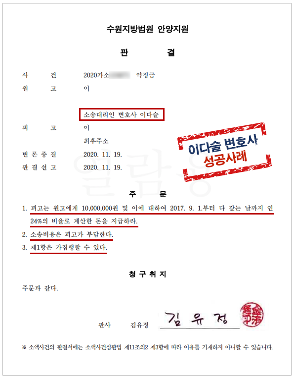 이다슬 대표 변호사는 원고와 피고와의 약정의 성립과 유효성을 입증하고 피고가 현 재판에 이르기까지 약정금 지급을 하지 않고 있음을 입증함에 따라 법원으로부터 피고의 약정금 지급은 물론, 약정금 이행시기가 지난 시기부터 다 갚는날까지 연 24%의 지연손해금을 인정하였습니다.