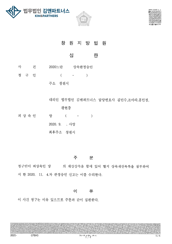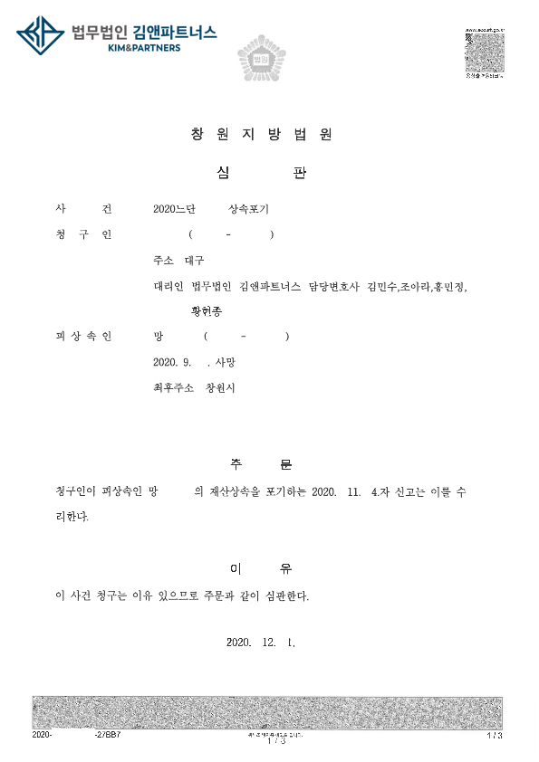 황변호사는 의뢰인의 사건을 담당하여 최근 창원지방법원에서 상속포기, 한정승인 결정문을 받았습니다.
