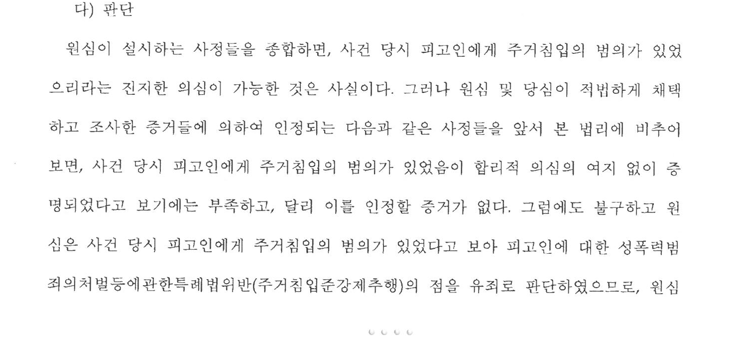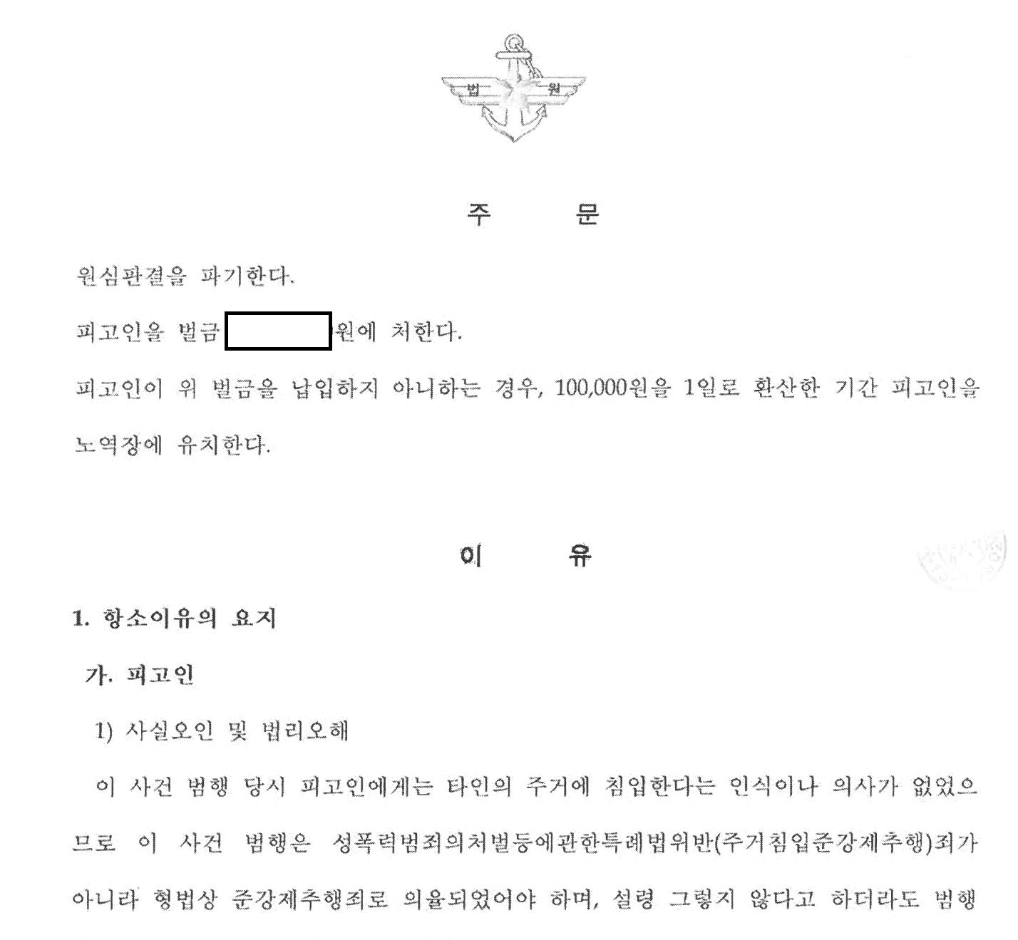 다소 부담은 되었지만 그래도 최선을 다해보자는 생각으로 피고인도 항소를 하였고, 이렇게 주거침입이 무죄가 되면서 성폭력범죄의처벌등에 관한 특례법이 아닌 일반 형법상 준강제추행으로 판결이 나왔습니다. 그리고 벌금이 선고된 것입니다.