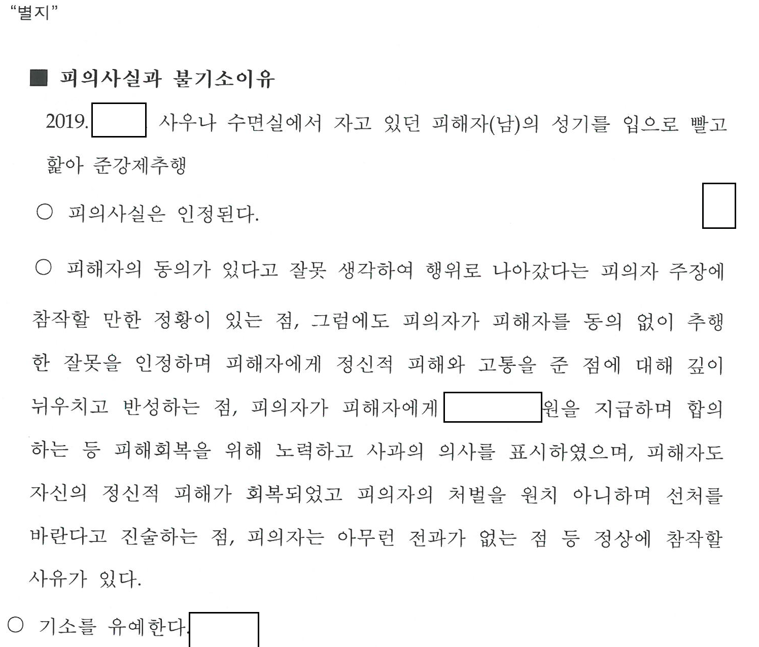 다시는 거짓을 말하지 않겠다고 하여 사실관계를 파악해보니 사우나 휴게실에서 다른 남성의 성기를 입으로 빨았던 것이 확인이 되었습니다. 상당한 시간동안 추행이 있었기에 죄질이 무겁다고 볼 여지가 있었습니다. 그리고 추행행위가 인정되기에 합의를 변호인인 제가 대리하여 진행을 하였습니다.