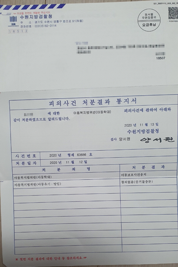 변호인은 기록을 면밀히 살핀 후 과연 신체적 학대가 있는 사안인지, 고의가 인정되는 사안인지, 방임에 해당하는지, 센터 의견은 어떠한지, 진료비에 비추어 신체적 손상이 있었는지 등에 대한 면밀한 검토 후 검찰에 변호인 의견서를 제출하였고, 이에 검찰은 재지휘를 통해 사건을 경찰로 내려보냈습니다. 경찰은 이후 아동학대 혐의는 기소의견, 방임은 불기소의견으로 다시 송치했습니다.