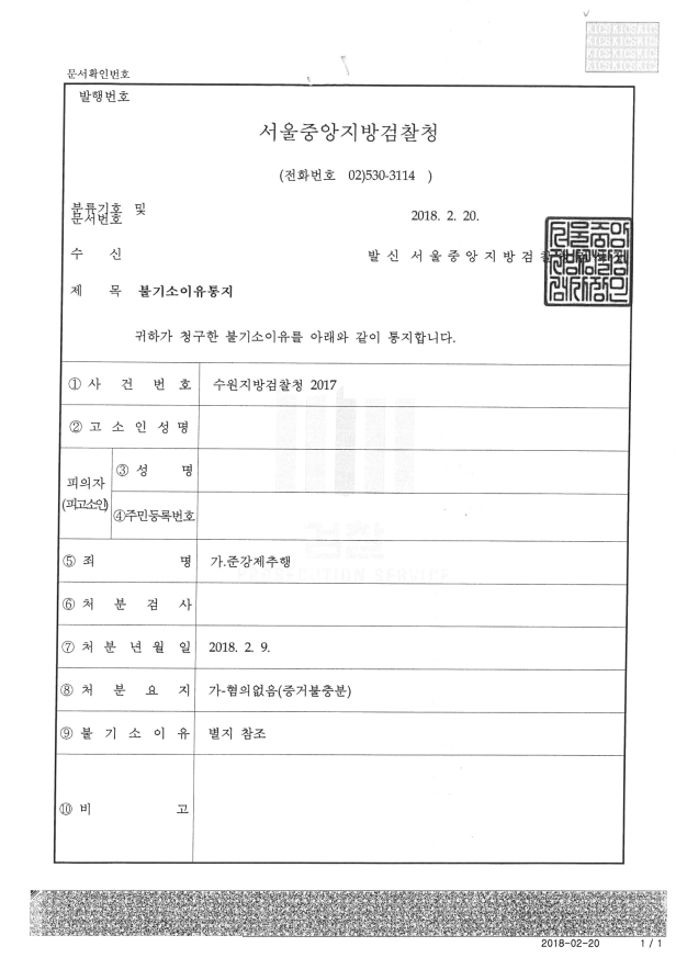 본 변호인의 주장을 적극 반영하고 피의사실을 인정할 수 없다며 혐의없음 처분 확정됨