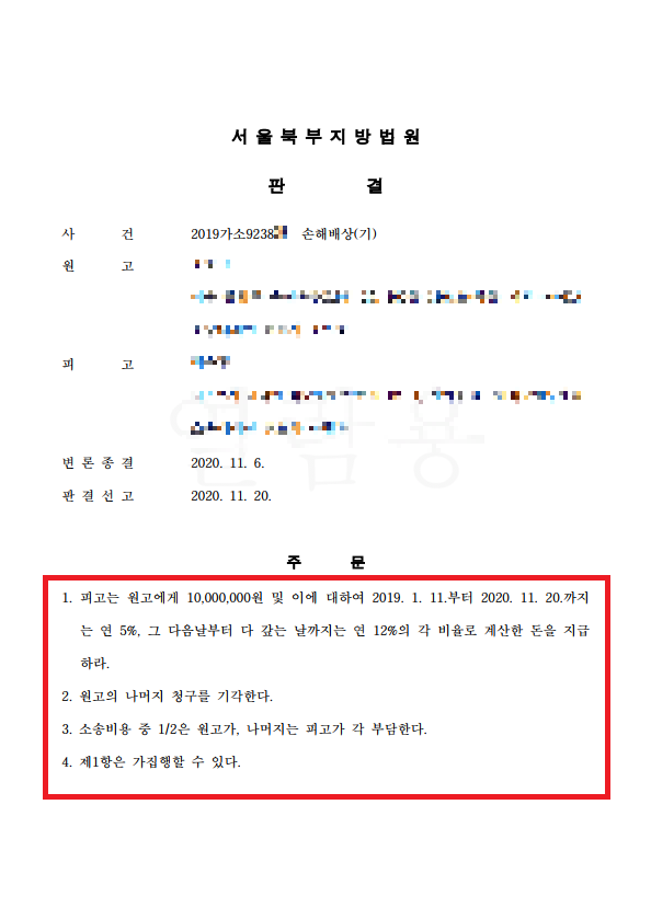 원고 청구금액 2,000만원 중 1,000만원만 인용됐고, 2019. 1.부터의 법정이자도 상당 부분 감액되는 좋은 결과를 이끌어 냈습니다.