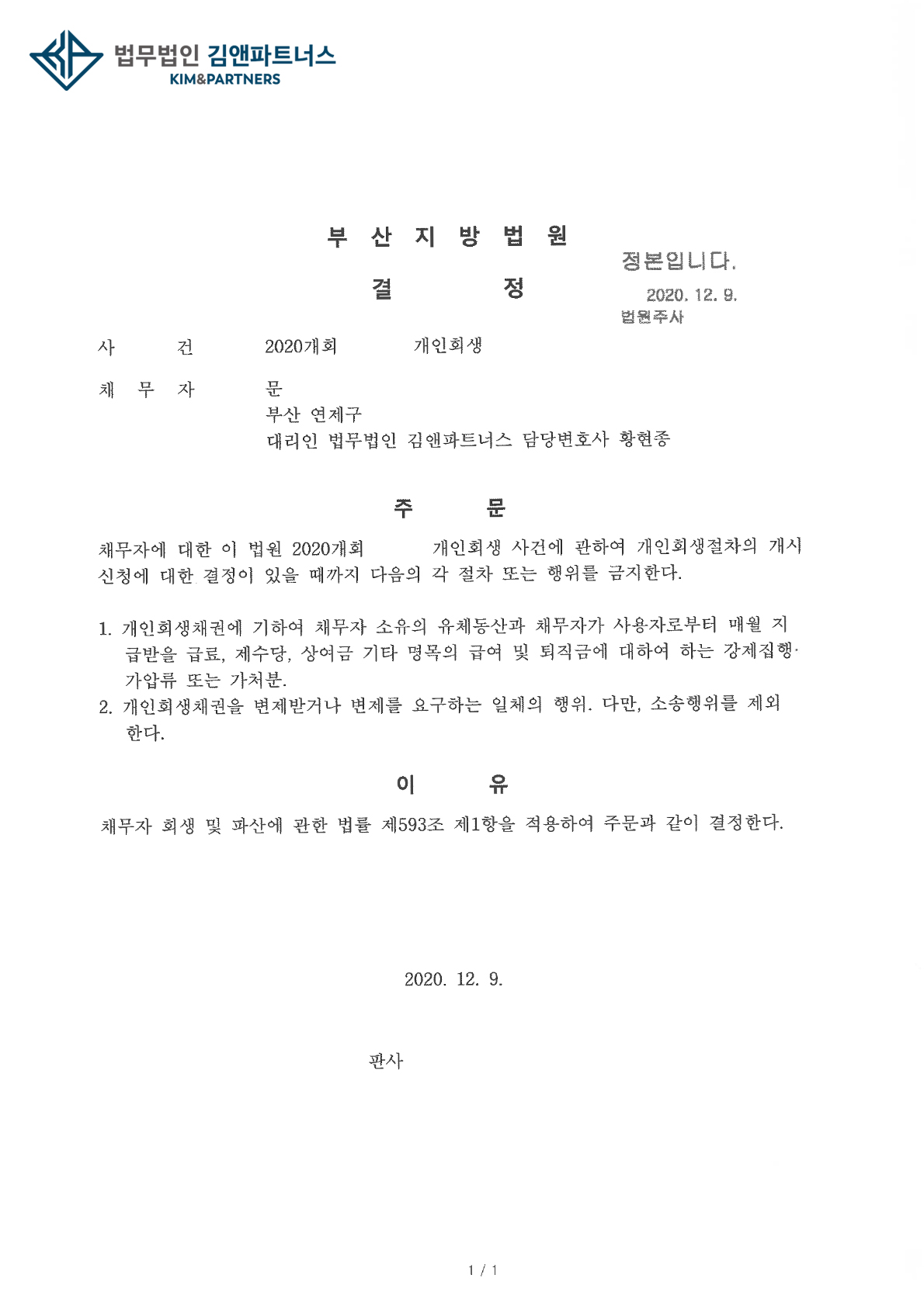 황변호사는 최근 부산지방법원에서 급여소득자인 의뢰인의 개인회생을 대리하여 금지명령을 받았습니다.