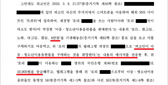 회사원 A씨는 퇴근하고 집으로 돌아와 휴대폰으로 트위터를 하다가 N번방 동영상 등 아청물을 판매한다는 글을 발견하고 글에 적힌 텔레그램 아이디로 연락하여 5만 원을 주고 N번방 동영상 등 아청물을 구매하였습니다.