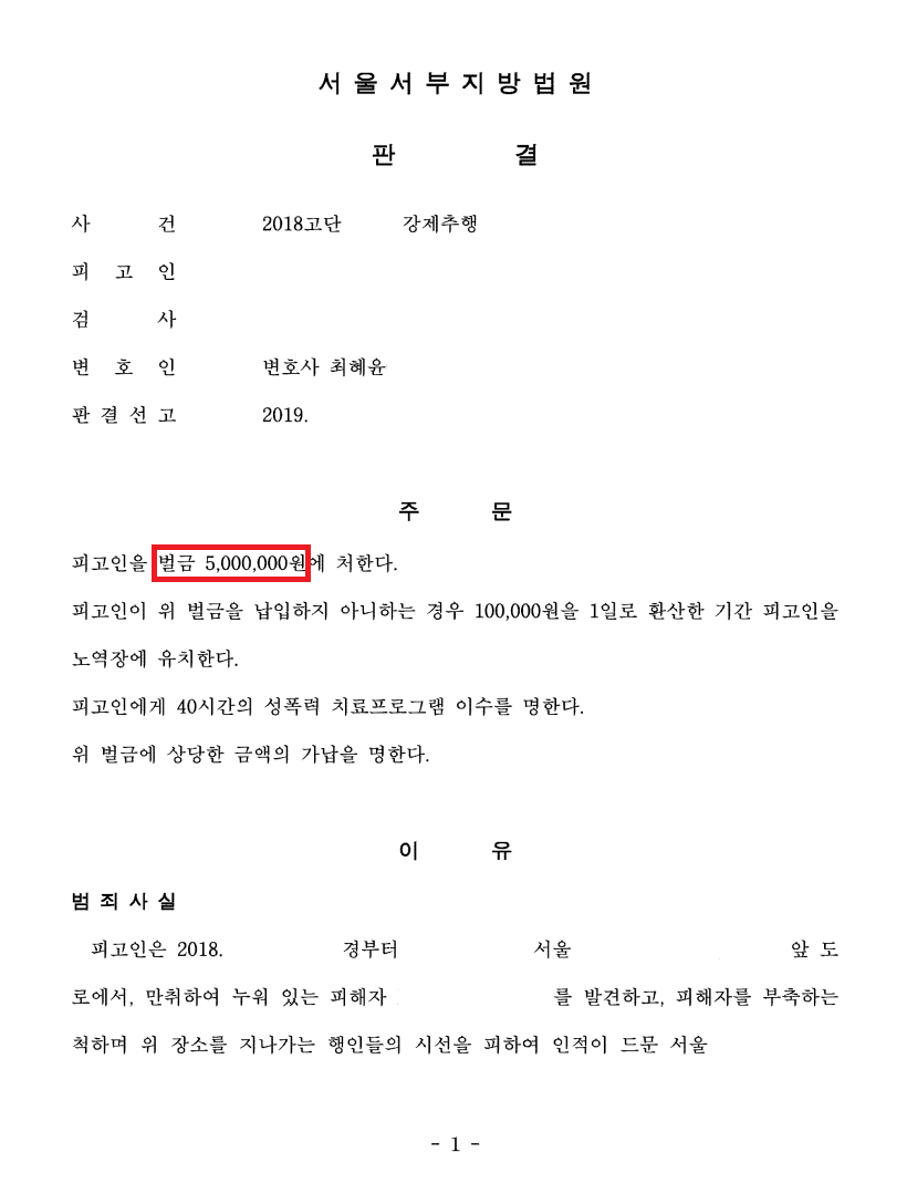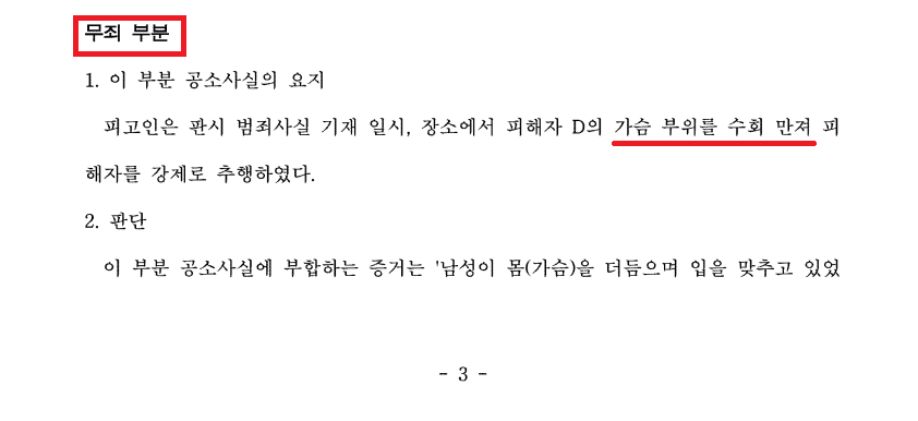 이 사건에서는 가슴을 만졌다는 부분에 대해서는 무죄를 받고 인정하는 부분에 관하여는 벌금형의 선처를 받는 것이 목표였습니다.