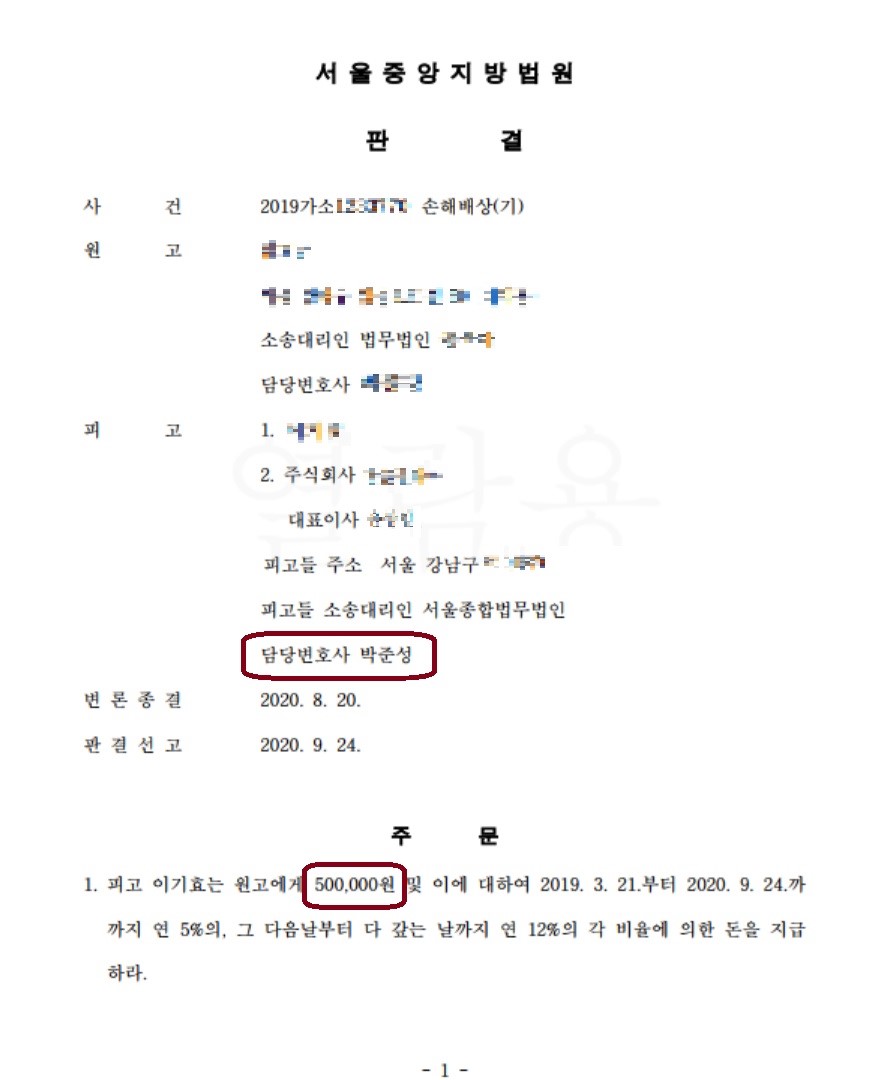 그 결과, 본 재판부는 본 변호사의 주장을 적극 반영하여 상대방 청구를 대폭 감액하여 합당한 금액으로 감축하는 판결을 선고하였습니다.