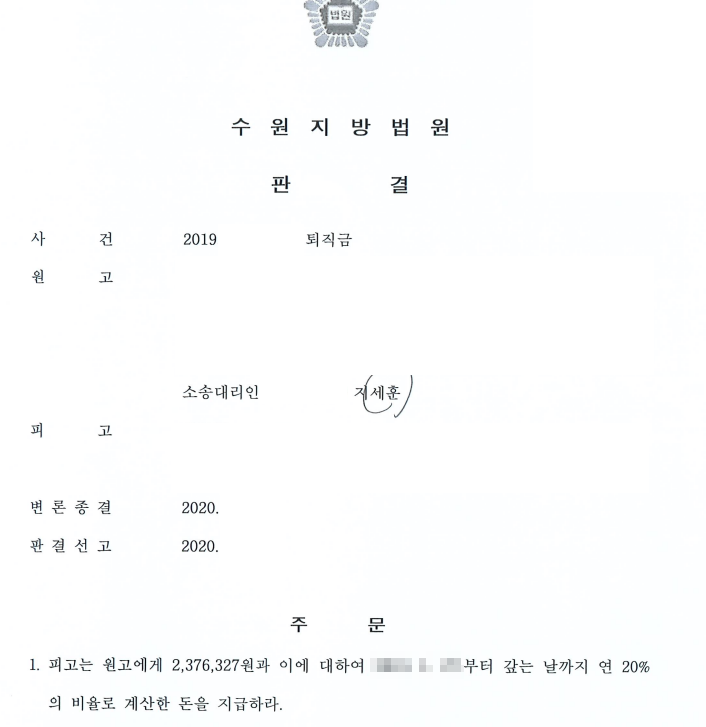 재판부는 지세훈 변호사의 주장을 받아들여 피고는 원고에게 미지금 퇴직금 전부를 지급하라는 판결을 내렸습니다.