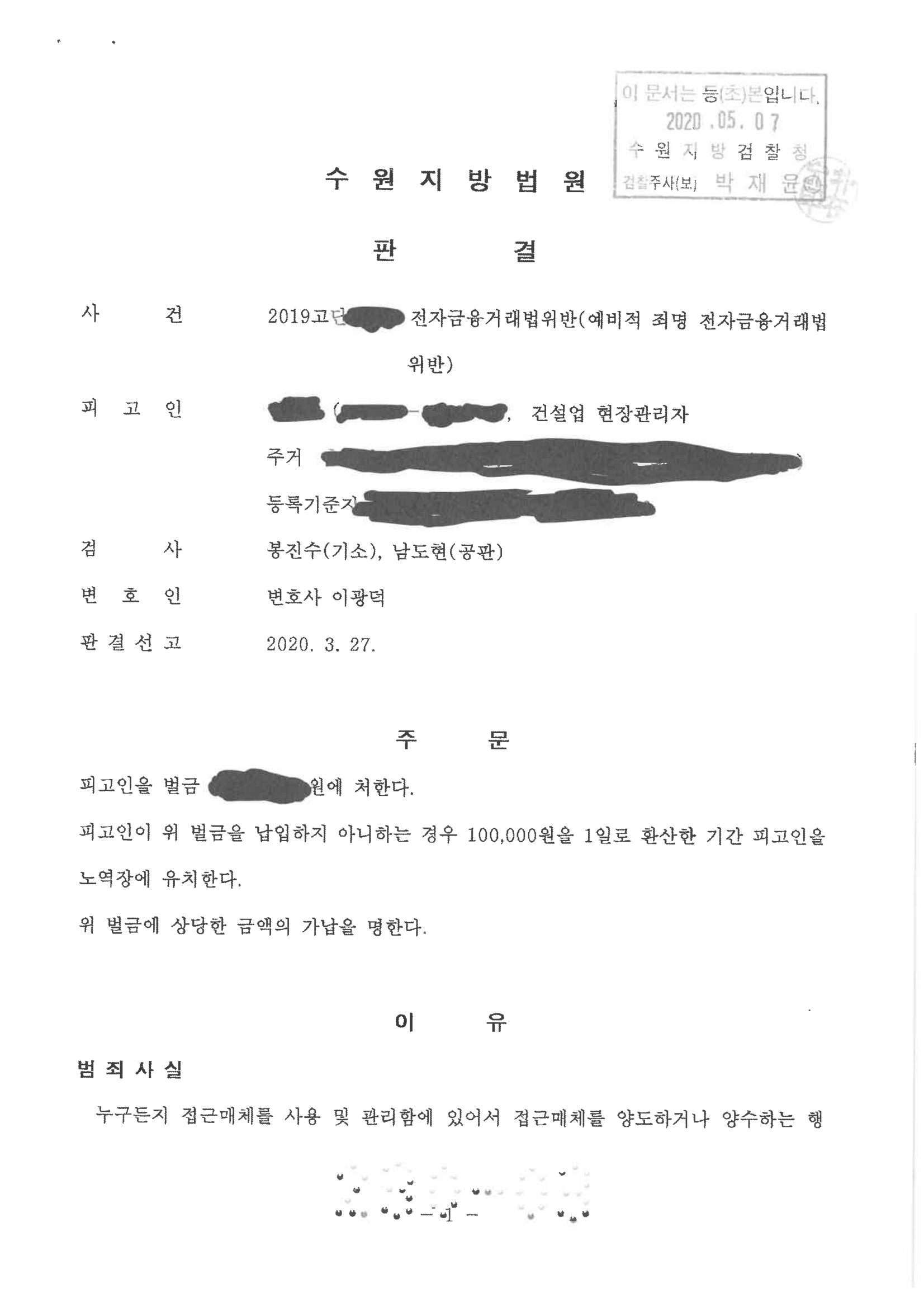 이에 검찰은 전자금융거래법 위반의 혐의로 의뢰인의 남편을 기소하게 된 것이었습니다.