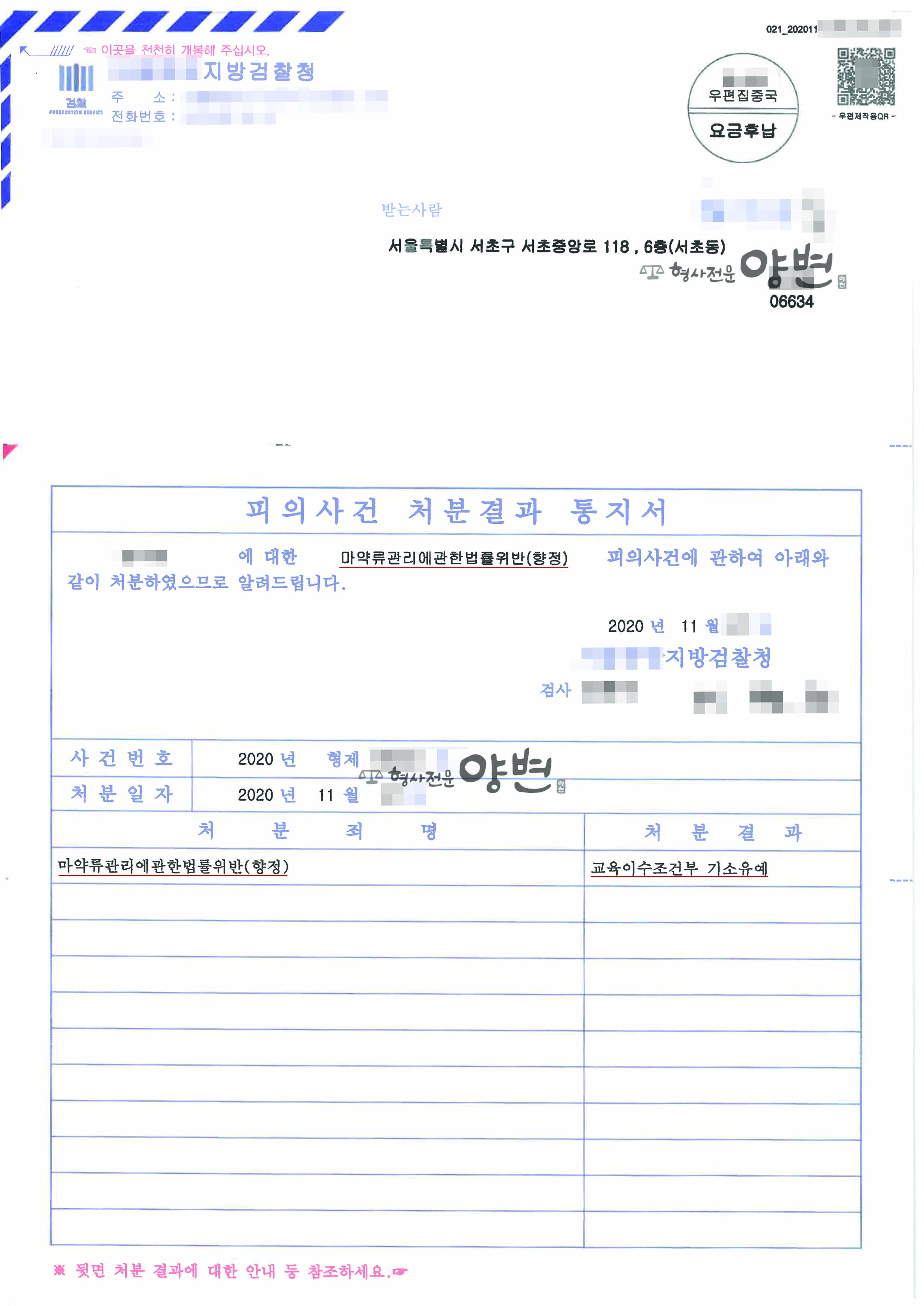 담당검사는 피의자신문조서와 변호인의견서를 검토한 후 의뢰인의 진술대로 투약횟수를 인정하는 한편, 의뢰인(피의자)에 대하여 교육이수조건부 기소유예 처분을 하였습니다.
