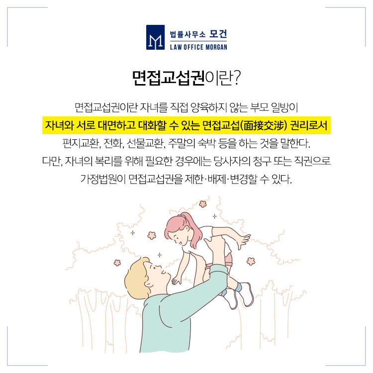 배우자 한 명이 외국인이어서 이혼 후 본국으로 출국하는 경우나, 부부 둘 다 한국인이지만 이혼 이후 거주지를 해외로 옮길 경우에 문제가 되는 것이 자녀의 친권과 양육자지정, 면접교섭권 행사입니다. 부부 둘 다 한국에서 거주하는 경우라면 서로 만나는 날짜와 시간을 정하는 것에 큰 어려움이 없지만 한쪽이 해외에서 거주한다면 면접교섭권을 제대로 행사하기가 어려운 경우가 있는데요.